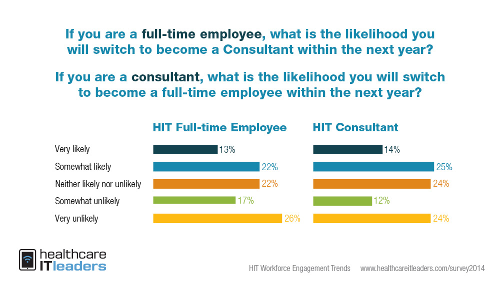 In our own survey of HIT full-time employees, only 12% said they were completely satisfied with their present job and would not currently consider a new one. Among our respondents, 24% said they were actively looking for a new job, 32% said they were occasionally looking, and 32% said they were not looking, but were open to a new job.