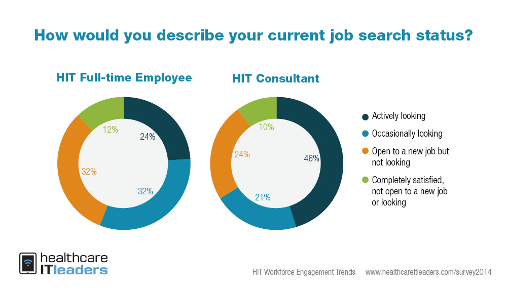 In our survey, only 12% of FTEs were truly out of the job market. That is, they said that were completely satisfied in their current role and not open to a new job. But 56% of current HIT employees said they were either “open to a new job, but not looking” or “occasionally looking.”