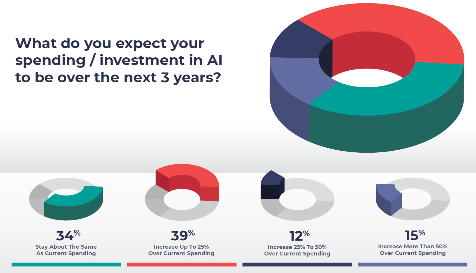 According to the survey, hospitals and health systems will invest more in AI over the next three years. Two-thirds of respondents indicated plans to increase spending by 25% or more on AI projects.